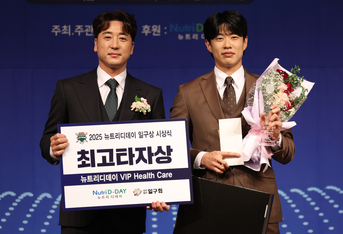 송성문(오른쪽)이 8일 서울 리베로호텔 청담에서 열린 2025 일구상 시상식에서 일구대상을 수상하고 기념촬영을 하고 있다. 사진=뉴시스