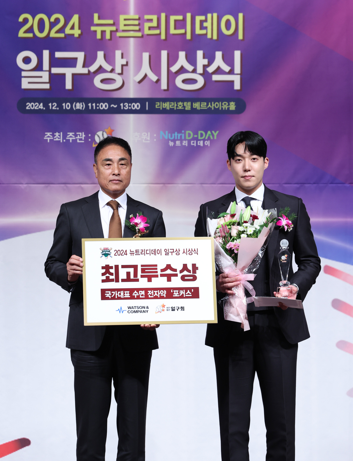 원태인(오른쪽)이 8일 서울 리베로호텔 청담에서 열린 2025 일구상 시상식에서 일구대상을 수상하고 기념촬영을 하고 있다. 사진=뉴시스