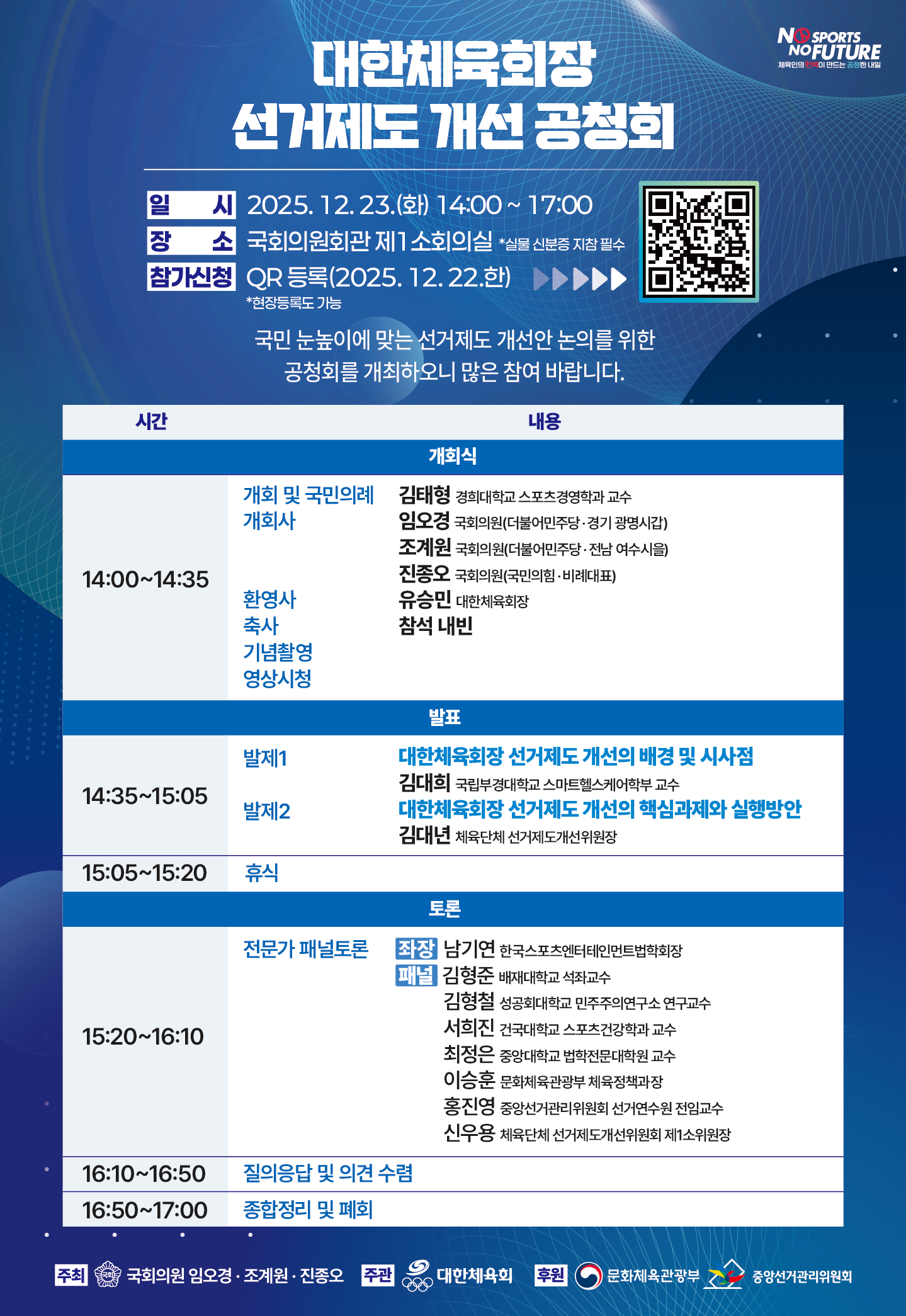 국회 문화체육관광위원회의 더불어민주당 임오경 의원(경기 광명시갑), 조계원 의원(전남 여수시을), 국민의힘 진종오 의원(비례대표)이 주최하고 대한체육회(회장 유승민)가 주관하며 문화체육관광부(장관 최휘영)와 중앙선거관리위원회(위원장 노태악)가 후원하는 ‘대한체육회장 선거제도 개선 공청회’가 23일 국회의원회관 제1소회의실에서 개최된다.